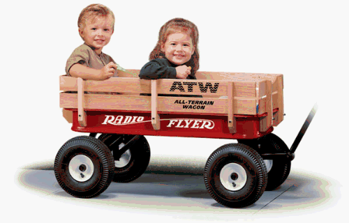 Nothing beats the classics. The Radio Flyer wagon has been a staple in playtime for over 70 years. The All-Terrain Steel And Wood Wagon is a full-size steel red wagon with natural-finished select wood sides and inflatable tires for smooth travel over rugged terrain. This wagon features high wooden sides an extra long handle with pneumatic inflatable tires and a weight capacity of 250 pounds.Air tires provide a super soft super quiet rideFull-size all-steel seamless wagon body with no scratch edgesExtra-long handle for easy pullingNo-pinch ball joint keeps fingers safeControlled turning radius prevents wagon from tippingHandle folds under wagonRecommended for ages over 18 monthsBody dimensions - 37.25 x 18.5 x 9.5 inches Wheel size - 10 x 4 inches